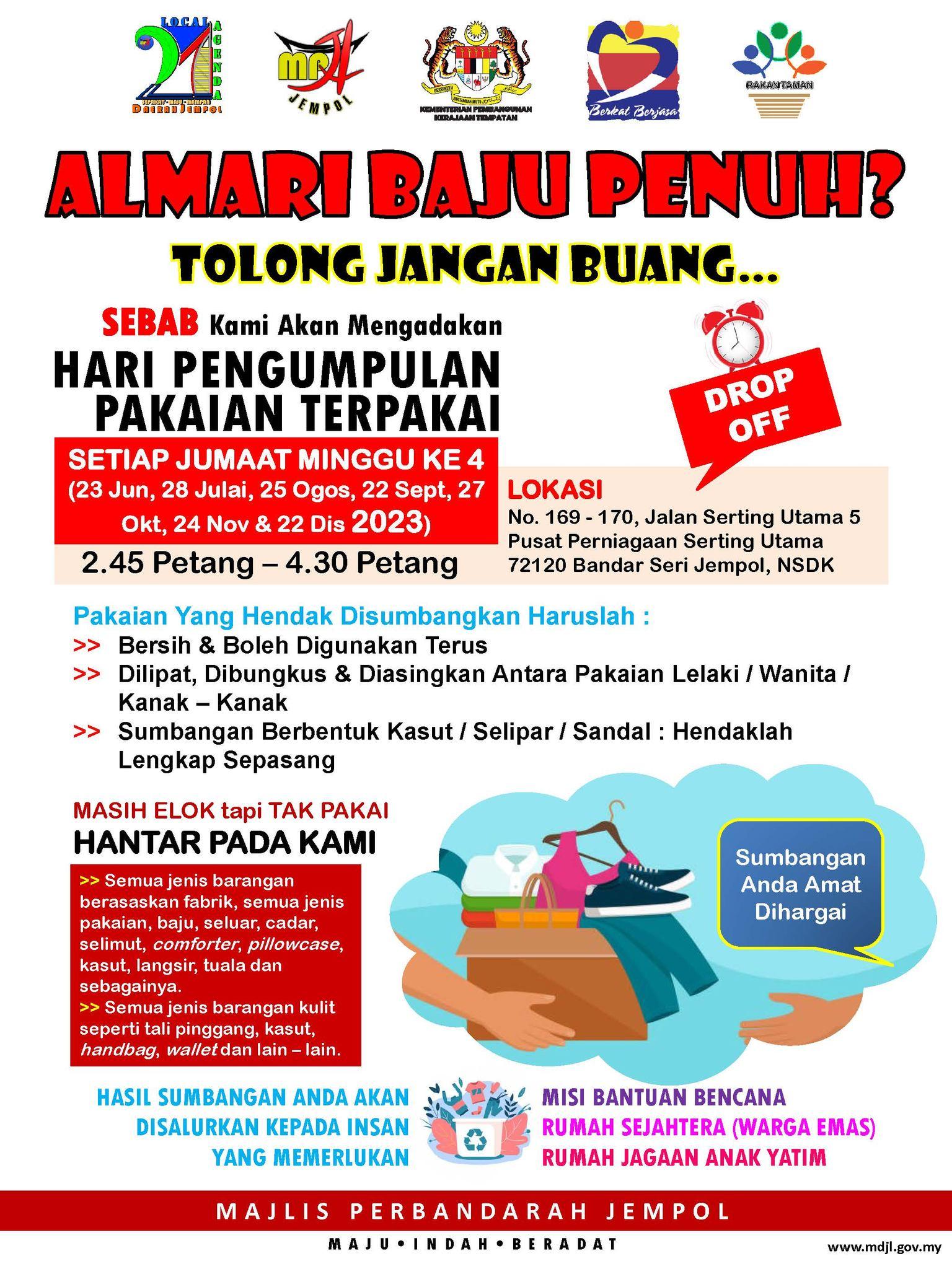 Terima kasih atas sokongan semua pihak yang menjayakan program Kitar Semula Pakaian Terpakai Tahun 2023. Atas sambutan yang sangat menggalakan, pihak MPJL akan melanjutkan tarikh penerimaan pakaian terpakai seperti dibawah.