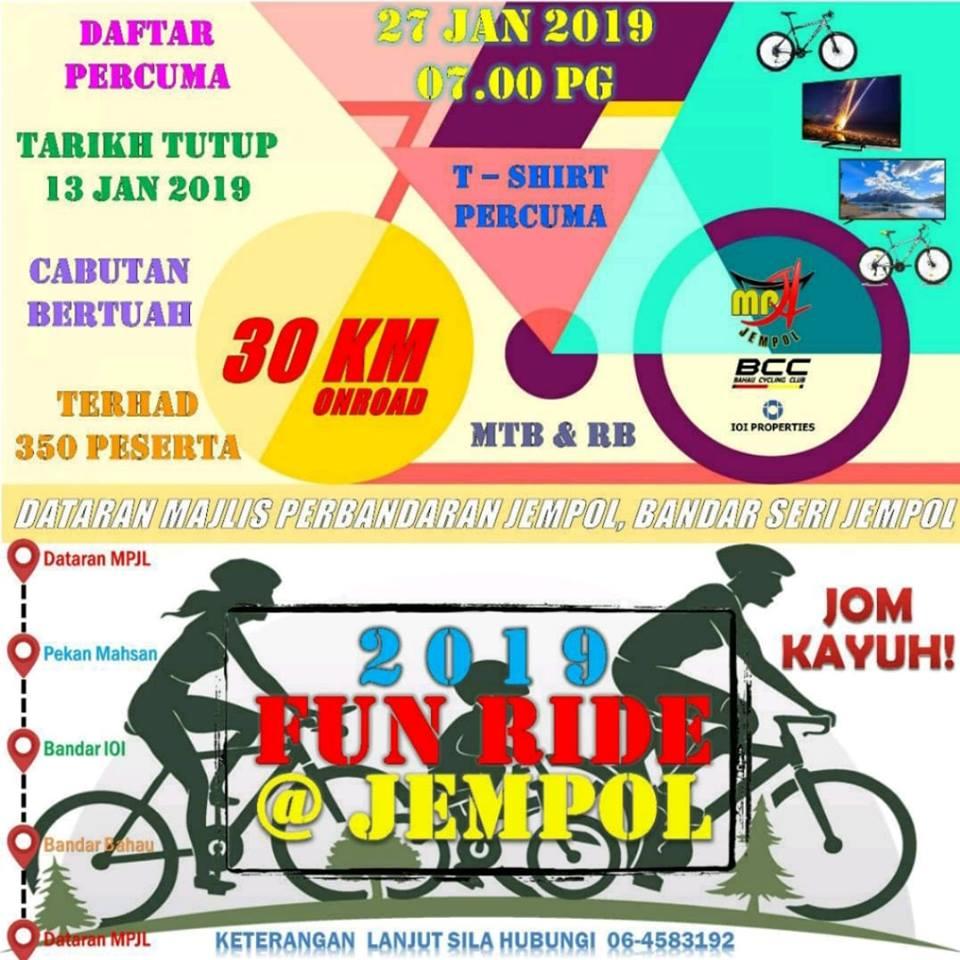 Jom kita meriahkan Fun Ride @ Jempol 2019 yang akan diadakan pada 27 Januari 2019 bersempena Pengisytiharan Majlis Perbandaran Jempol. Jika berminat boleh menghubungi nombor 064583192.