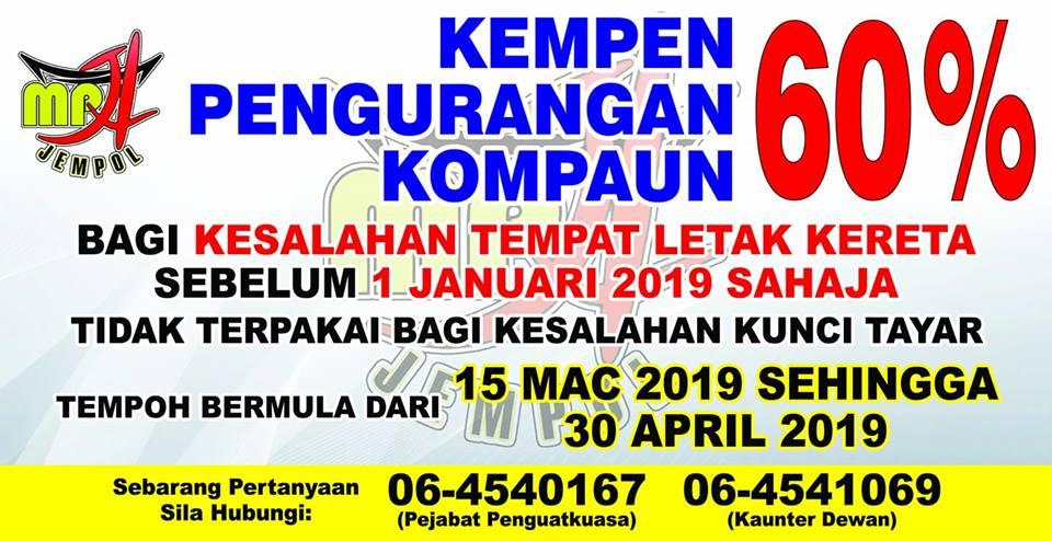 BANDAR SERI JEMPOL 13 MAC- Kempen Pengurangan Kompaun sehingga 60% bagi kesalahan tempat letak kereta yang telah dikompaun sebelum tarikh 1 Januari 2019 sahaja (Kompaun yang bertarikh bagi tahun 2018 dan sebelumnya sahaja akan diberi pengurangan) Kompaun ini tidak terpakai bagi kesalahan kunci tayar. Kempen ni bermula 15 Mac 2019 sehingga 30 April 2019. Orang ramai disarankan untuk mengambil peluang ini bagi mengelakkan kenderaan anda dikenakan tindakan dimasa akan datang.