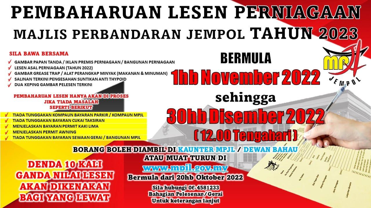 PEMBAHARUAN LESEN PERNIAGAAN BAGI TAHUN 2023 BOLEH DIBUAT SEHINGGA 30 DISEMBER 2022. *KEGAGALAN MEMPERBAHARUI LESEN AKAN MENYEBABKAN TUAN/PUAN DIKENAKAN DENDA 10 KALI GANDA DARI NILAI LESEN*.