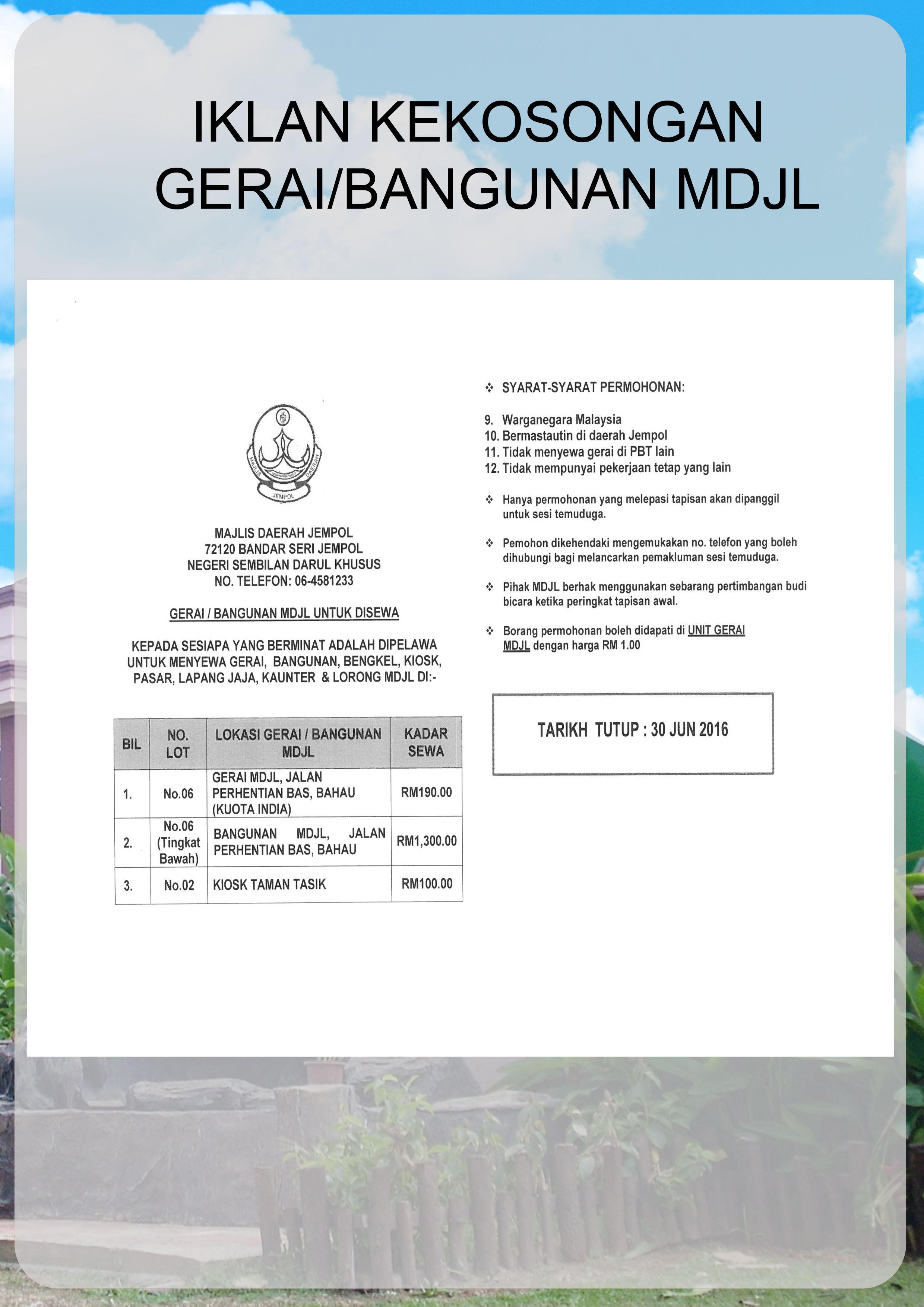 IKLAN GERAI / BANGUNAN MAJLIS DAERAH JEMPOL UNTUK DISEWA