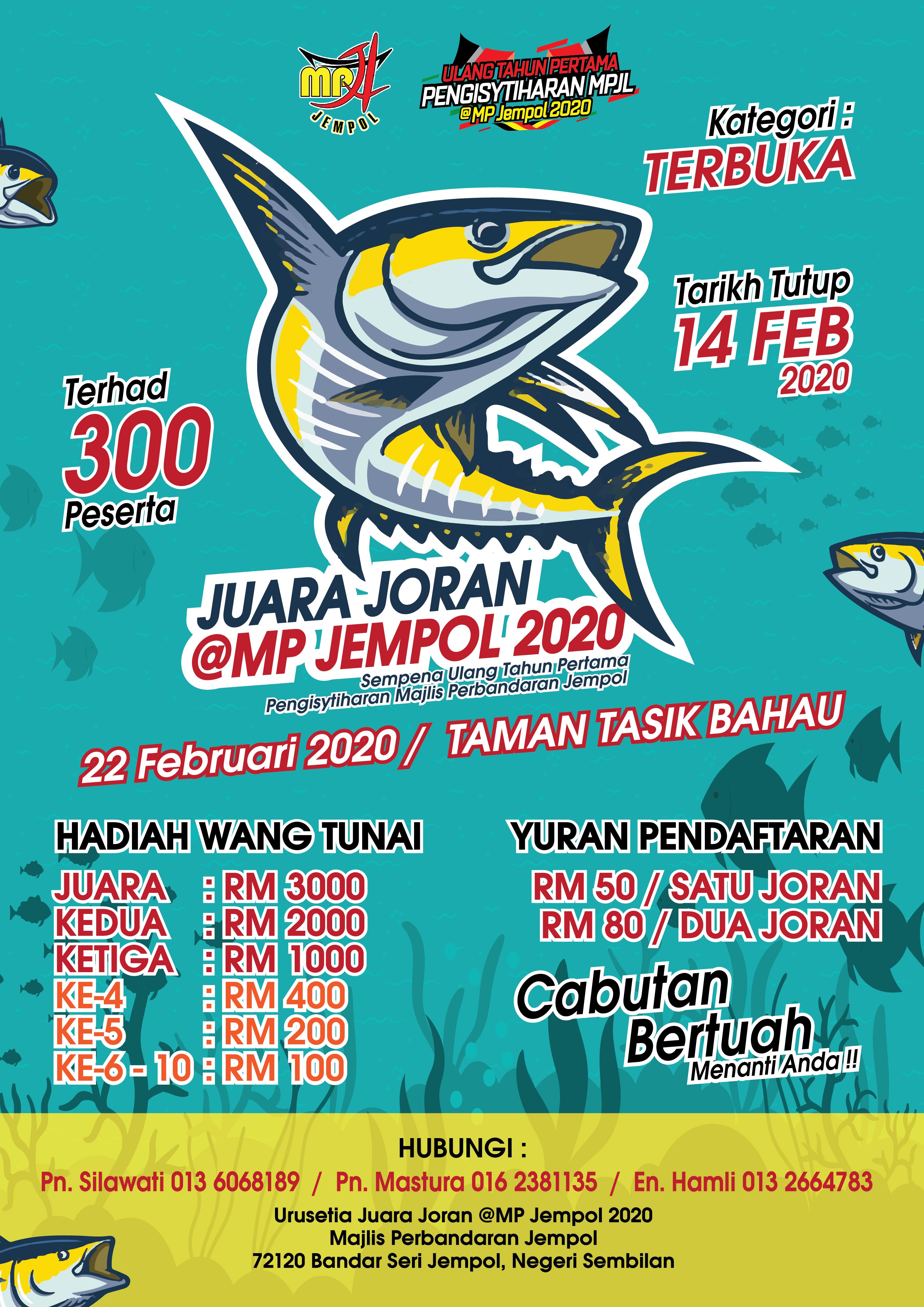 Bersempena Sambutan Ulang Tahun Pertama Pengisytiharan Majlis Perbandaran Jempol, pihak majlis berbesar hati mempelawa anda semua untuk menyertai program JUARA JORAN @ MP JEMPOL 2020 pada 22 FEB 2020 bertempat di TAMAN TASIK BAHAU. (https://goo.gl/maps/RDTBtix4cQZh875E8)