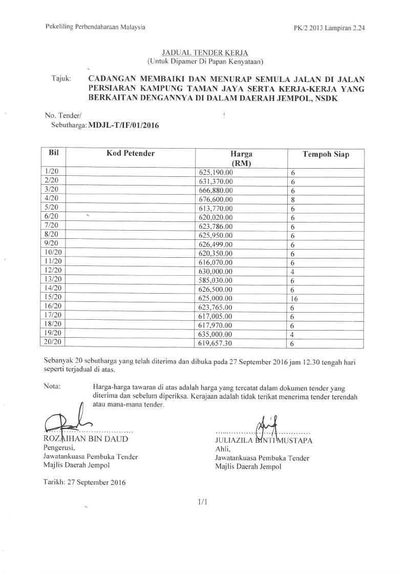 Berikut merupakan senarai petender yang memasuki tender Cadangan Membaiki Dan Menurap Semula Jalan Di Jalan Persiaran Kampung Taman Jaya Serta Kerja-Kerja Yang Berkaitan Denganya Di Dalam Daerah Jempol
